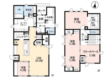 | 間取内訳/間取備考 | LDK20.2帖 / 洋7.7帖 / 洋5.3帖 / 洋5.3帖 / 洋4.2帖 / その他5.2帖 / 4LDKは2階洋室を仕切って利用した場合です。 |
